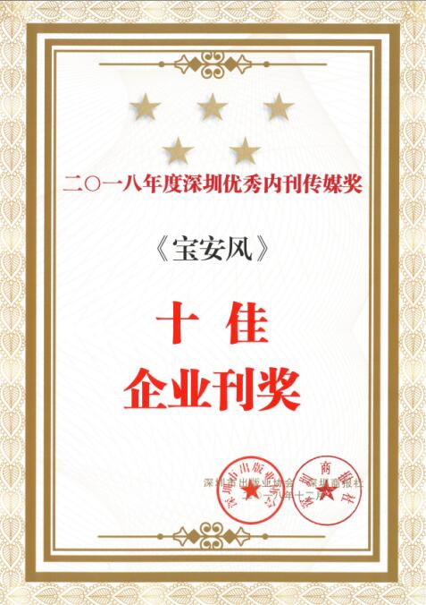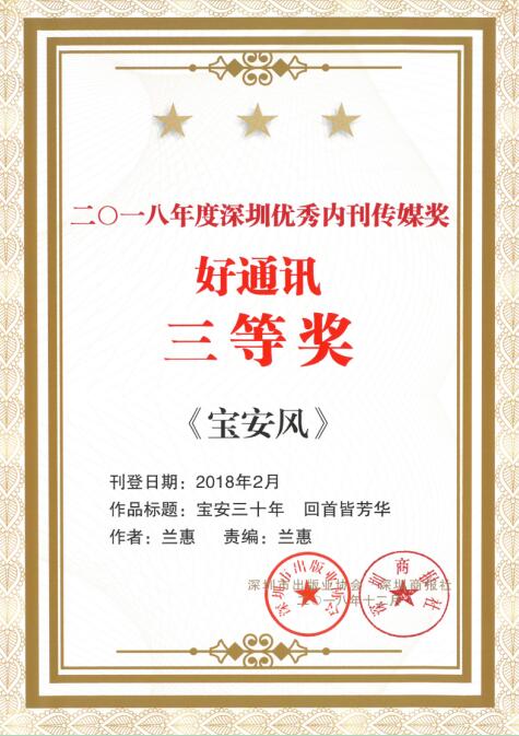 12月14日, 2018深圳內(nèi)刊界總結(jié)交流大會(huì)暨“優(yōu)秀內(nèi)刊傳媒獎(jiǎng)”表彰大會(huì)召開(kāi),集團(tuán)內(nèi)刊《寶安風(fēng)》在四百多家企業(yè)內(nèi)刊中脫穎而出,再度獲評(píng)“十佳企業(yè)刊獎(jiǎng)”,同時(shí)斬獲“優(yōu)秀經(jīng)濟(jì)專(zhuān)題”等3個(gè)單項(xiàng)獎(jiǎng)。