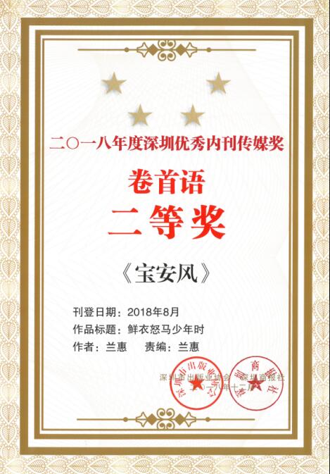 深圳內(nèi)刊年度綜合獎(jiǎng)“優(yōu)秀內(nèi)刊傳媒獎(jiǎng)”,由市出版業(yè)協(xié)會(huì)、深圳商報(bào)聯(lián)合組織深圳市新聞出版廣電局等資深文化傳媒專(zhuān)家評(píng)定,每年評(píng)選一次,代表著深圳內(nèi)刊的最高榮譽(yù)。《寶安風(fēng)》在強(qiáng)手林立的深圳內(nèi)刊界再接再厲,再次獲評(píng)“深圳優(yōu)秀內(nèi)刊傳媒獎(jiǎng)”之“十佳企業(yè)刊獎(jiǎng)”。同時(shí),282期“精益人才專(zhuān)題”獲“經(jīng)濟(jì)專(zhuān)題”三等獎(jiǎng),286期卷首《鮮衣怒馬少年時(shí)》獲評(píng)“卷首語(yǔ)”二等獎(jiǎng),283期通訊“寶安三十年 回首皆芳華”獲評(píng)“好通訊”三等獎(jiǎng)。