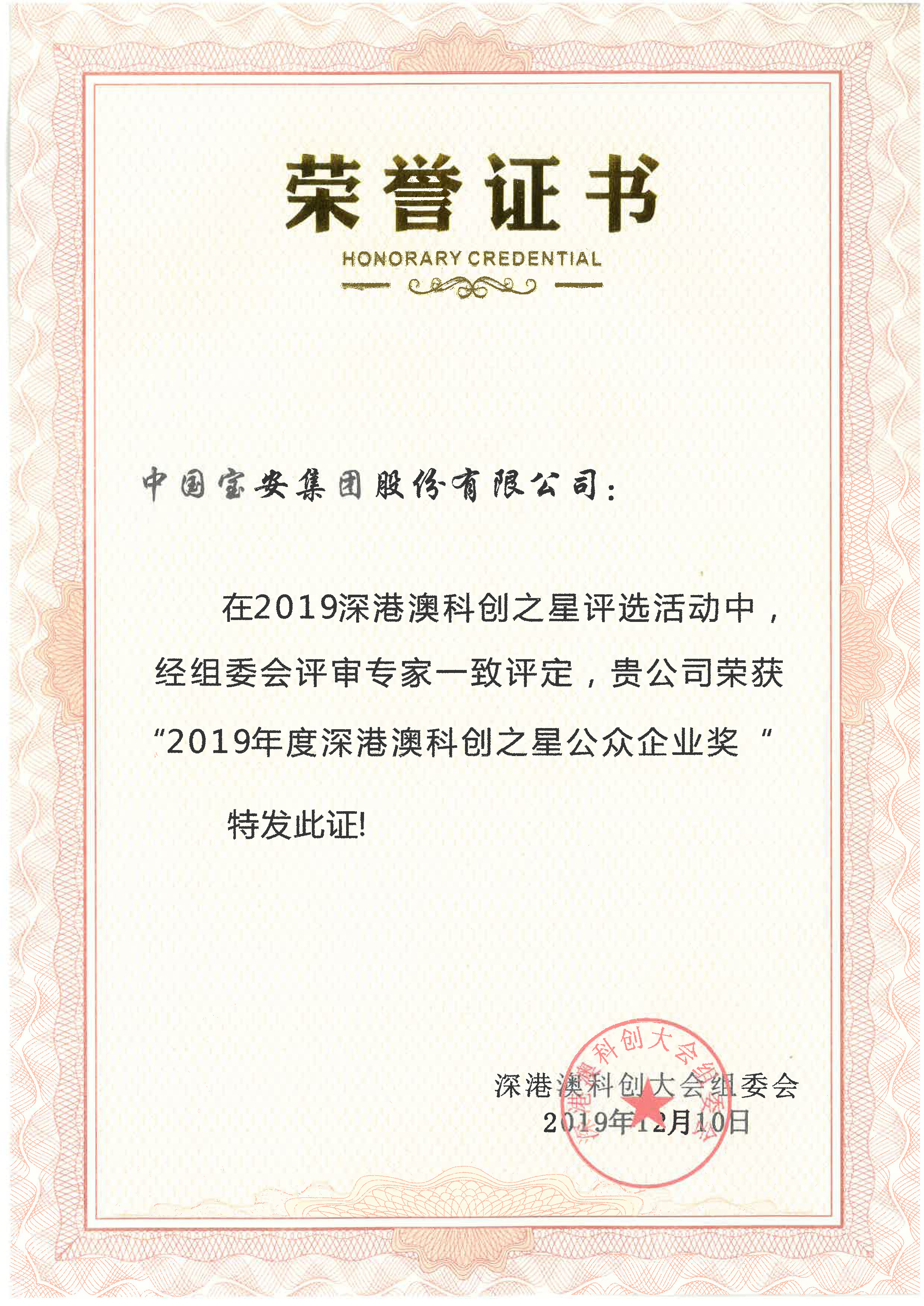 1210日,2019年深港澳科創大會暨科創之星頒獎典禮在深圳召開,集團榮獲科創之星公眾企業獎。