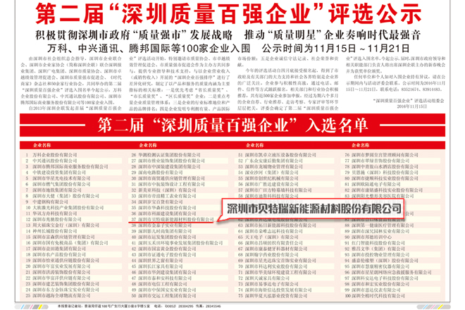 1115日,經(jīng)過為期半年的行業(yè)推薦、走訪考察、專家評審等環(huán)節(jié),第二屆“深圳質量百強企業(yè)”評選名單公布,集團所屬的貝特瑞公司當選深圳質量百強企業(yè),成為深圳企業(yè)的“質量明星”。