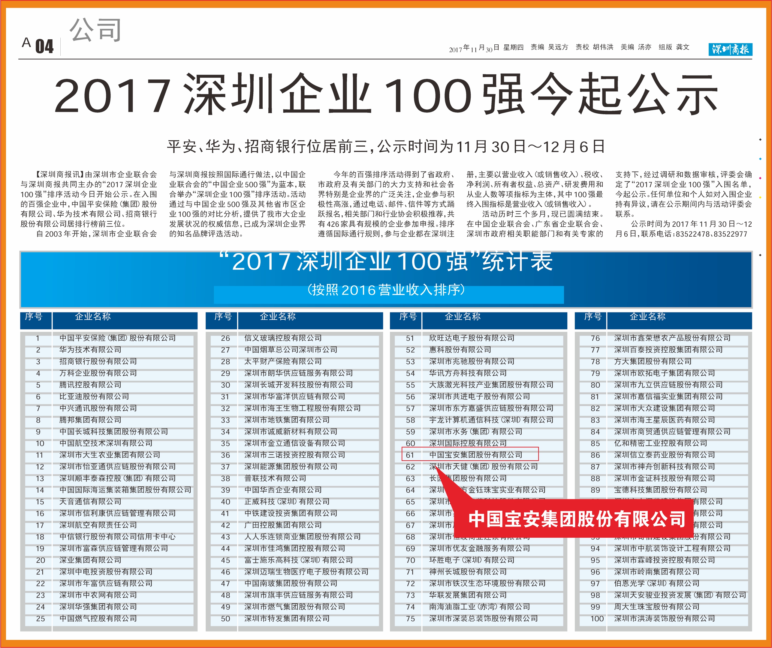 11月30 日,由深圳市企業聯合會與深圳商報共同主辦的“2017深圳企業100強”排序活動正式開始公示,中國寶安集團在榜單中61名。